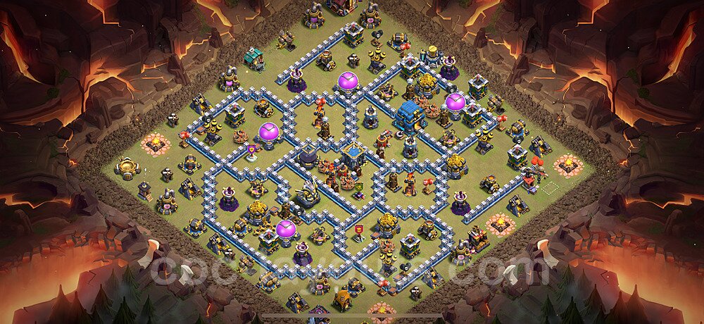 This Town Hall 12 war base is specifically designed to defend against 2-star and 3-star attacks in Clan Wars and Clan War Leagues. The strategic placement of defenses creates multiple compartments that force attackers to use more troops and spells than anticipated. Key defensive structures like Eagle Artillery, Inferno Towers, and X-Bows are positioned to cover crucial sections of the base, making it extremely difficult for opponents to secure a perfect attack. The core of this war base features a centralized Town Hall and Clan Castle, protected by multiple layers of walls and high-damage defenses. This layout forces attackers to commit significant resources just to reach the center, often leaving them without enough firepower to secure the Town Hall destruction. The anti-2-star design ensures that even if attackers breach the outer defenses, they'll struggle to achieve a 50% destruction rating. Air defenses are strategically spread to counter popular air attack strategies like LaLoon (Lava Hound + Balloons) and Electrone (Electro Dragons + Stone Slammer). The symmetrical trap placement and strategic Hidden Tesla positions create deadly surprise elements that can completely derail an attacker's plan. This base has been tested against various meta attack strategies and has consistently proven effective in preventing 3-star attacks.
