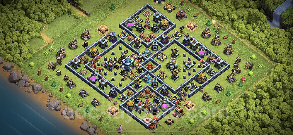 This Town Hall 13 war base is specifically designed to defend against 2-star and 3-star attacks in Clan Wars and Clan War Leagues. The strategic placement of defenses creates multiple compartments that force attackers to use more troops and spells than anticipated. Key defensive structures like Eagle Artillery, Inferno Towers, and X-Bows are positioned to cover crucial sections of the base, making it extremely difficult for opponents to secure a perfect attack. The core of this war base features a centralized Town Hall and Clan Castle, protected by multiple layers of walls and high-damage defenses. This layout forces attackers to commit significant resources just to reach the center, often leaving them without enough firepower to secure the Town Hall destruction. The anti-2-star design ensures that even if attackers breach the outer defenses, they'll struggle to achieve a 50% destruction rating. Air defenses are strategically spread to counter popular air attack strategies like LaLoon (Lava Hound + Balloons) and Electrone (Electro Dragons + Stone Slammer). The symmetrical trap placement and strategic Hidden Tesla positions create deadly surprise elements that can completely derail an attacker's plan. This base has been tested against various meta attack strategies and has consistently proven effective in preventing 3-star attacks.