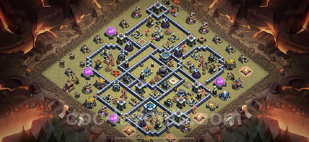 This Town Hall 13 war base is specifically designed to defend against 2-star and 3-star attacks in Clan Wars and Clan War Leagues. The strategic placement of defenses creates multiple compartments that force attackers to use more troops and spells than anticipated. Key defensive structures like Eagle Artillery, Inferno Towers, and X-Bows are positioned to cover crucial sections of the base, making it extremely difficult for opponents to secure a perfect attack. The core of this war base features a centralized Town Hall and Clan Castle, protected by multiple layers of walls and high-damage defenses. This layout forces attackers to commit significant resources just to reach the center, often leaving them without enough firepower to secure the Town Hall destruction. The anti-2-star design ensures that even if attackers breach the outer defenses, they'll struggle to achieve a 50% destruction rating. Air defenses are strategically spread to counter popular air attack strategies like LaLoon (Lava Hound + Balloons) and Electrone (Electro Dragons + Stone Slammer). The symmetrical trap placement and strategic Hidden Tesla positions create deadly surprise elements that can completely derail an attacker's plan. This base has been tested against various meta attack strategies and has consistently proven effective in preventing 3-star attacks.
