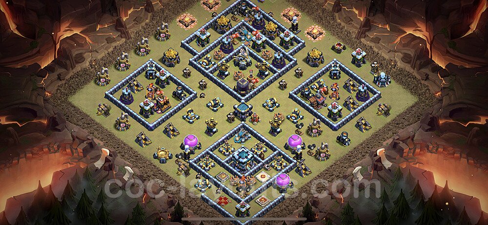 This Town Hall 13 war base is specifically designed to defend against 2-star and 3-star attacks in Clan Wars and Clan War Leagues. The strategic placement of defenses creates multiple compartments that force attackers to use more troops and spells than anticipated. Key defensive structures like Eagle Artillery, Inferno Towers, and X-Bows are positioned to cover crucial sections of the base, making it extremely difficult for opponents to secure a perfect attack. The core of this war base features a centralized Town Hall and Clan Castle, protected by multiple layers of walls and high-damage defenses. This layout forces attackers to commit significant resources just to reach the center, often leaving them without enough firepower to secure the Town Hall destruction. The anti-2-star design ensures that even if attackers breach the outer defenses, they'll struggle to achieve a 50% destruction rating. Air defenses are strategically spread to counter popular air attack strategies like LaLoon (Lava Hound + Balloons) and Electrone (Electro Dragons + Stone Slammer). The symmetrical trap placement and strategic Hidden Tesla positions create deadly surprise elements that can completely derail an attacker's plan. This base has been tested against various meta attack strategies and has consistently proven effective in preventing 3-star attacks.