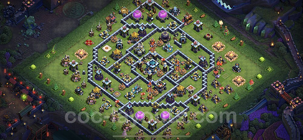 This Town Hall 13 farming base is optimized to protect your resources including Gold, Elixir, and Dark Elixir from raiders. The layout features centralized storages with multiple compartments that make it extremely difficult for attackers to steal large amounts of resources in a single raid. This design philosophy prioritizes resource protection over trophies, making it ideal for players focused on upgrading their village. The strategic placement of resource storages ensures they are well-protected by high-damage defenses like X-Bows, Inferno Towers, and Eagle Artillery. Each storage is surrounded by multiple wall layers and defensive structures, forcing attackers to invest heavily in troops and spells to reach your loot. The farming base design also incorporates strategic dead zones where attackers' troops tend to path inefficiently, wasting time and taking heavy damage from nearby defenses. Collectors and mines are positioned on the outer edges as "bait" while your main storages remain heavily protected in the core. This layout has proven effective against common farming strategies like BARCH (Barbarians + Archers), GoWiPe (Golems + Wizards + Pekka), and mass Miner attacks. The compartmentalized design prevents attackers from funneling straight to your resources, ensuring you maintain your hard-earned loot for important upgrades.