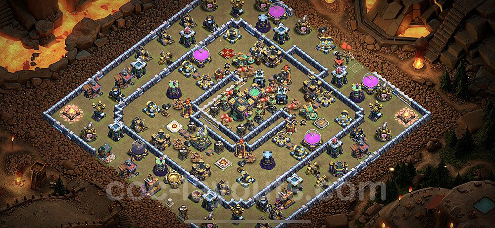 This Town Hall 14 war base is specifically designed to defend against 2-star and 3-star attacks in Clan Wars and Clan War Leagues. The strategic placement of defenses creates multiple compartments that force attackers to use more troops and spells than anticipated. Key defensive structures like Eagle Artillery, Inferno Towers, and X-Bows are positioned to cover crucial sections of the base, making it extremely difficult for opponents to secure a perfect attack. The core of this war base features a centralized Town Hall and Clan Castle, protected by multiple layers of walls and high-damage defenses. This layout forces attackers to commit significant resources just to reach the center, often leaving them without enough firepower to secure the Town Hall destruction. The anti-2-star design ensures that even if attackers breach the outer defenses, they'll struggle to achieve a 50% destruction rating. Air defenses are strategically spread to counter popular air attack strategies like LaLoon (Lava Hound + Balloons) and Electrone (Electro Dragons + Stone Slammer). The symmetrical trap placement and strategic Hidden Tesla positions create deadly surprise elements that can completely derail an attacker's plan. This base has been tested against various meta attack strategies and has consistently proven effective in preventing 3-star attacks.