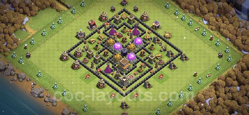 This Town Hall 8 farming base is optimized to protect your resources including Gold, Elixir, and Dark Elixir from raiders. The layout features centralized storages with multiple compartments that make it extremely difficult for attackers to steal large amounts of resources in a single raid. This design philosophy prioritizes resource protection over trophies, making it ideal for players focused on upgrading their village. The strategic placement of resource storages ensures they are well-protected by high-damage defenses like X-Bows, Inferno Towers, and Eagle Artillery. Each storage is surrounded by multiple wall layers and defensive structures, forcing attackers to invest heavily in troops and spells to reach your loot. The farming base design also incorporates strategic dead zones where attackers' troops tend to path inefficiently, wasting time and taking heavy damage from nearby defenses. Collectors and mines are positioned on the outer edges as "bait" while your main storages remain heavily protected in the core. This layout has proven effective against common farming strategies like BARCH (Barbarians + Archers), GoWiPe (Golems + Wizards + Pekka), and mass Miner attacks. The compartmentalized design prevents attackers from funneling straight to your resources, ensuring you maintain your hard-earned loot for important upgrades.