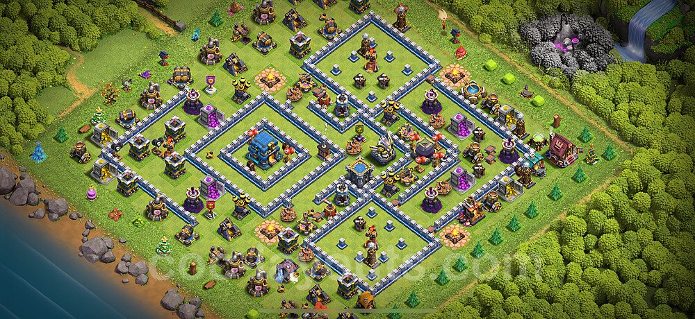 This Town Hall 12 trophy pushing base is engineered for maximum defensive capability to help you climb and maintain higher trophy leagues. The design focuses on preventing attackers from achieving the 50% destruction threshold needed to steal trophies, with a heavily fortified Town Hall position and anti-2-star compartmentalization. This layout is perfect for competitive players aiming to reach Champion, Titan, or Legend League. The strategic placement of defenses creates overlapping coverage that makes it nearly impossible for attackers to access the core without facing devastating firepower. High-DPS defenses like Inferno Towers and Eagle Artillery are positioned to protect the Town Hall from all angles, while splash damage defenses counter mass troop strategies. The anti-air coverage is exceptionally strong, with Air Defenses, Air Sweepers, and Wizard Towers positioned to eliminate aerial threats quickly. Trap placement in this trophy base is optimized to counter popular attack strategies seen in higher leagues. Spring Traps are positioned to eliminate Hog Riders and Valkyries, while Giant Bombs target Balloons and Wall Breakers. The base's asymmetrical design confuses attackers' pathing algorithms, causing troops to split and take unnecessary damage. This layout has been battle-tested in Legend League and has consistently helped players maintain their trophies against skilled attackers.