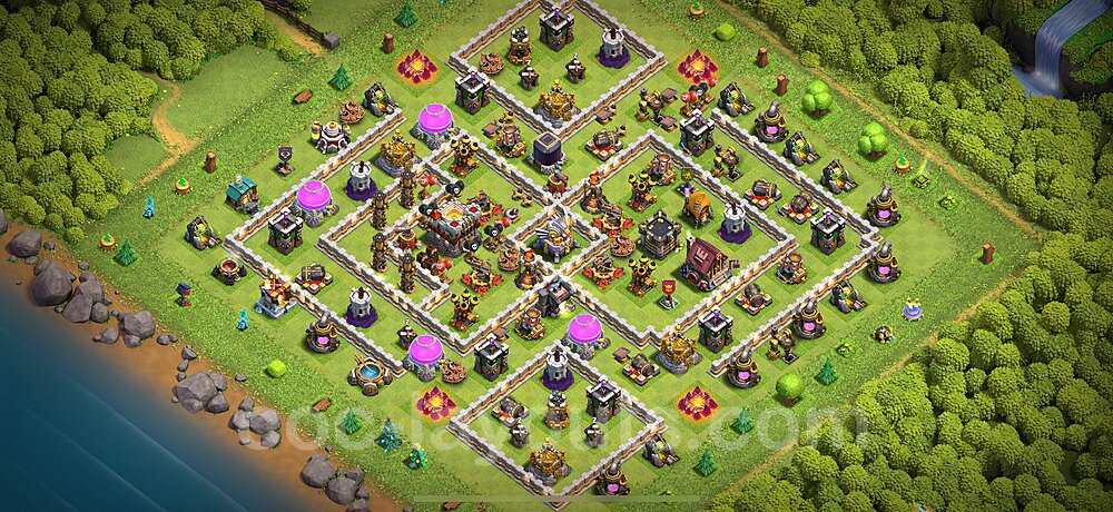 This Town Hall 11 trophy pushing base is engineered for maximum defensive capability to help you climb and maintain higher trophy leagues. The design focuses on preventing attackers from achieving the 50% destruction threshold needed to steal trophies, with a heavily fortified Town Hall position and anti-2-star compartmentalization. This layout is perfect for competitive players aiming to reach Champion, Titan, or Legend League. The strategic placement of defenses creates overlapping coverage that makes it nearly impossible for attackers to access the core without facing devastating firepower. High-DPS defenses like Inferno Towers and Eagle Artillery are positioned to protect the Town Hall from all angles, while splash damage defenses counter mass troop strategies. The anti-air coverage is exceptionally strong, with Air Defenses, Air Sweepers, and Wizard Towers positioned to eliminate aerial threats quickly. Trap placement in this trophy base is optimized to counter popular attack strategies seen in higher leagues. Spring Traps are positioned to eliminate Hog Riders and Valkyries, while Giant Bombs target Balloons and Wall Breakers. The base's asymmetrical design confuses attackers' pathing algorithms, causing troops to split and take unnecessary damage. This layout has been battle-tested in Legend League and has consistently helped players maintain their trophies against skilled attackers.