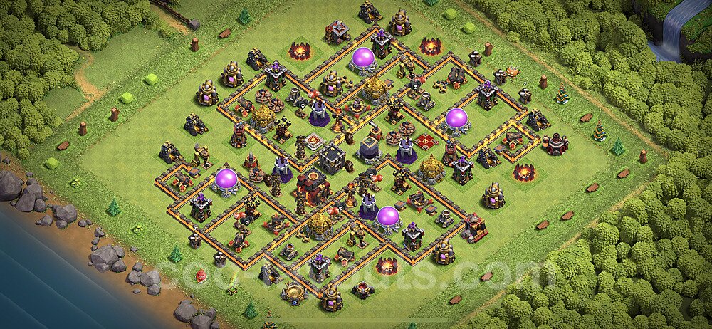 This Town Hall 10 hybrid base offers the best of both worlds - strong resource protection combined with effective trophy defense. The versatile design makes it an excellent choice for players who want to protect their loot while maintaining their trophy count. This balanced approach ensures you don't sacrifice one aspect of defense for another, making it ideal for active players across all league levels. The hybrid layout features centralized resource storages alongside a well-protected Town Hall, with multiple defensive layers that deter both farming raids and trophy pushers. High-value targets are strategically positioned within overlapping defense ranges, forcing attackers to make difficult choices about which objectives to prioritize. The compartmentalized design prevents attackers from easily achieving both loot destruction and the Town Hall kill in a single attack. Defense placement in this hybrid base creates strong coverage against both ground and air attacks. Inferno Towers, X-Bows, and Eagle Artillery work in concert to eliminate threats quickly, while splash damage defenses like Wizard Towers and Bomb Towers counter swarm strategies. The base's funnel-resistant design and strategic trap placement make it effective against popular attack strategies including QC LaLoon (Queen Charge Lava Hound Balloon), Blizzard attacks, and Yeti Smash compositions.