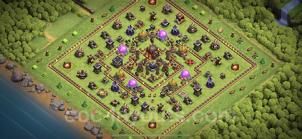 This Town Hall 10 hybrid base offers the best of both worlds - strong resource protection combined with effective trophy defense. The versatile design makes it an excellent choice for players who want to protect their loot while maintaining their trophy count. This balanced approach ensures you don't sacrifice one aspect of defense for another, making it ideal for active players across all league levels. The hybrid layout features centralized resource storages alongside a well-protected Town Hall, with multiple defensive layers that deter both farming raids and trophy pushers. High-value targets are strategically positioned within overlapping defense ranges, forcing attackers to make difficult choices about which objectives to prioritize. The compartmentalized design prevents attackers from easily achieving both loot destruction and the Town Hall kill in a single attack. Defense placement in this hybrid base creates strong coverage against both ground and air attacks. Inferno Towers, X-Bows, and Eagle Artillery work in concert to eliminate threats quickly, while splash damage defenses like Wizard Towers and Bomb Towers counter swarm strategies. The base's funnel-resistant design and strategic trap placement make it effective against popular attack strategies including QC LaLoon (Queen Charge Lava Hound Balloon), Blizzard attacks, and Yeti Smash compositions.