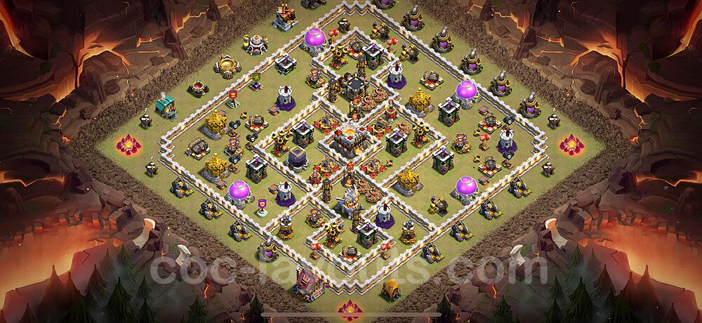 This Town Hall 11 hybrid base offers the best of both worlds - strong resource protection combined with effective trophy defense. The versatile design makes it an excellent choice for players who want to protect their loot while maintaining their trophy count. This balanced approach ensures you don't sacrifice one aspect of defense for another, making it ideal for active players across all league levels. The hybrid layout features centralized resource storages alongside a well-protected Town Hall, with multiple defensive layers that deter both farming raids and trophy pushers. High-value targets are strategically positioned within overlapping defense ranges, forcing attackers to make difficult choices about which objectives to prioritize. The compartmentalized design prevents attackers from easily achieving both loot destruction and the Town Hall kill in a single attack. Defense placement in this hybrid base creates strong coverage against both ground and air attacks. Inferno Towers, X-Bows, and Eagle Artillery work in concert to eliminate threats quickly, while splash damage defenses like Wizard Towers and Bomb Towers counter swarm strategies. The base's funnel-resistant design and strategic trap placement make it effective against popular attack strategies including QC LaLoon (Queen Charge Lava Hound Balloon), Blizzard attacks, and Yeti Smash compositions.