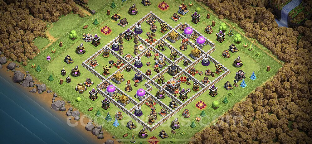 This Town Hall 11 hybrid base offers the best of both worlds - strong resource protection combined with effective trophy defense. The versatile design makes it an excellent choice for players who want to protect their loot while maintaining their trophy count. This balanced approach ensures you don't sacrifice one aspect of defense for another, making it ideal for active players across all league levels. The hybrid layout features centralized resource storages alongside a well-protected Town Hall, with multiple defensive layers that deter both farming raids and trophy pushers. High-value targets are strategically positioned within overlapping defense ranges, forcing attackers to make difficult choices about which objectives to prioritize. The compartmentalized design prevents attackers from easily achieving both loot destruction and the Town Hall kill in a single attack. Defense placement in this hybrid base creates strong coverage against both ground and air attacks. Inferno Towers, X-Bows, and Eagle Artillery work in concert to eliminate threats quickly, while splash damage defenses like Wizard Towers and Bomb Towers counter swarm strategies. The base's funnel-resistant design and strategic trap placement make it effective against popular attack strategies including QC LaLoon (Queen Charge Lava Hound Balloon), Blizzard attacks, and Yeti Smash compositions.