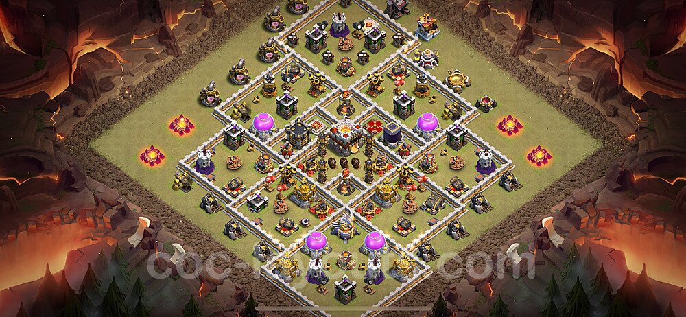 This Town Hall 11 war base is specifically designed to defend against 2-star and 3-star attacks in Clan Wars and Clan War Leagues. The strategic placement of defenses creates multiple compartments that force attackers to use more troops and spells than anticipated. Key defensive structures like Eagle Artillery, Inferno Towers, and X-Bows are positioned to cover crucial sections of the base, making it extremely difficult for opponents to secure a perfect attack. The core of this war base features a centralized Town Hall and Clan Castle, protected by multiple layers of walls and high-damage defenses. This layout forces attackers to commit significant resources just to reach the center, often leaving them without enough firepower to secure the Town Hall destruction. The anti-2-star design ensures that even if attackers breach the outer defenses, they'll struggle to achieve a 50% destruction rating. Air defenses are strategically spread to counter popular air attack strategies like LaLoon (Lava Hound + Balloons) and Electrone (Electro Dragons + Stone Slammer). The symmetrical trap placement and strategic Hidden Tesla positions create deadly surprise elements that can completely derail an attacker's plan. This base has been tested against various meta attack strategies and has consistently proven effective in preventing 3-star attacks.