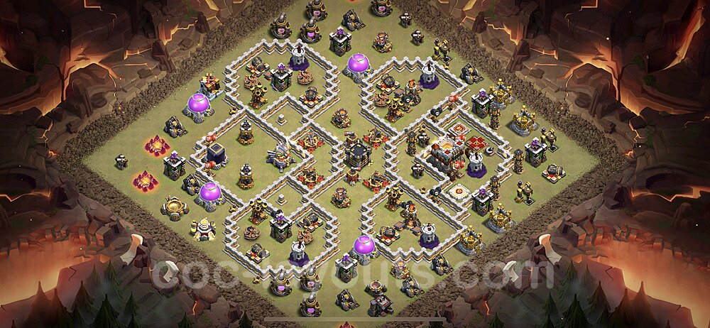 This Town Hall 11 war base is specifically designed to defend against 2-star and 3-star attacks in Clan Wars and Clan War Leagues. The strategic placement of defenses creates multiple compartments that force attackers to use more troops and spells than anticipated. Key defensive structures like Eagle Artillery, Inferno Towers, and X-Bows are positioned to cover crucial sections of the base, making it extremely difficult for opponents to secure a perfect attack. The core of this war base features a centralized Town Hall and Clan Castle, protected by multiple layers of walls and high-damage defenses. This layout forces attackers to commit significant resources just to reach the center, often leaving them without enough firepower to secure the Town Hall destruction. The anti-2-star design ensures that even if attackers breach the outer defenses, they'll struggle to achieve a 50% destruction rating. Air defenses are strategically spread to counter popular air attack strategies like LaLoon (Lava Hound + Balloons) and Electrone (Electro Dragons + Stone Slammer). The symmetrical trap placement and strategic Hidden Tesla positions create deadly surprise elements that can completely derail an attacker's plan. This base has been tested against various meta attack strategies and has consistently proven effective in preventing 3-star attacks.