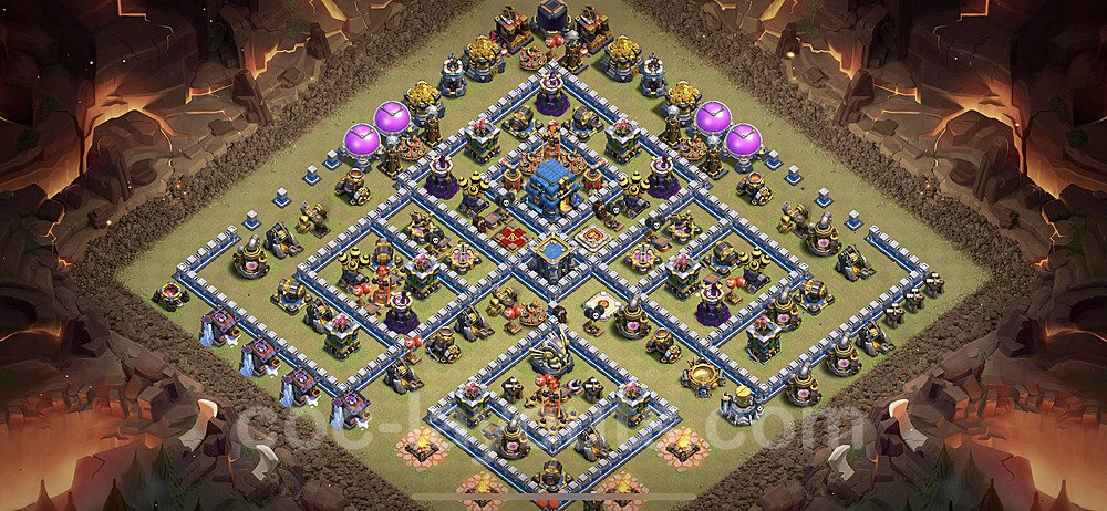 This Town Hall 12 war base is specifically designed to defend against 2-star and 3-star attacks in Clan Wars and Clan War Leagues. The strategic placement of defenses creates multiple compartments that force attackers to use more troops and spells than anticipated. Key defensive structures like Eagle Artillery, Inferno Towers, and X-Bows are positioned to cover crucial sections of the base, making it extremely difficult for opponents to secure a perfect attack. The core of this war base features a centralized Town Hall and Clan Castle, protected by multiple layers of walls and high-damage defenses. This layout forces attackers to commit significant resources just to reach the center, often leaving them without enough firepower to secure the Town Hall destruction. The anti-2-star design ensures that even if attackers breach the outer defenses, they'll struggle to achieve a 50% destruction rating. Air defenses are strategically spread to counter popular air attack strategies like LaLoon (Lava Hound + Balloons) and Electrone (Electro Dragons + Stone Slammer). The symmetrical trap placement and strategic Hidden Tesla positions create deadly surprise elements that can completely derail an attacker's plan. This base has been tested against various meta attack strategies and has consistently proven effective in preventing 3-star attacks.