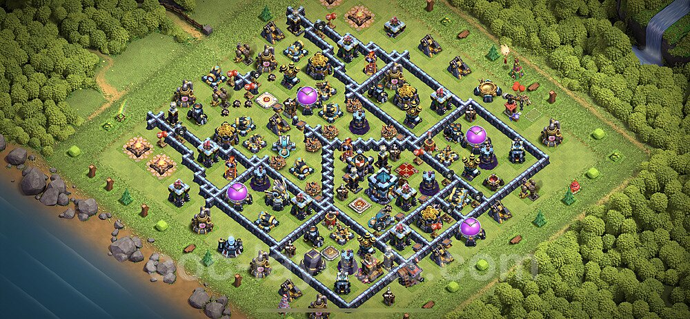 This Town Hall 13 war base is specifically designed to defend against 2-star and 3-star attacks in Clan Wars and Clan War Leagues. The strategic placement of defenses creates multiple compartments that force attackers to use more troops and spells than anticipated. Key defensive structures like Eagle Artillery, Inferno Towers, and X-Bows are positioned to cover crucial sections of the base, making it extremely difficult for opponents to secure a perfect attack. The core of this war base features a centralized Town Hall and Clan Castle, protected by multiple layers of walls and high-damage defenses. This layout forces attackers to commit significant resources just to reach the center, often leaving them without enough firepower to secure the Town Hall destruction. The anti-2-star design ensures that even if attackers breach the outer defenses, they'll struggle to achieve a 50% destruction rating. Air defenses are strategically spread to counter popular air attack strategies like LaLoon (Lava Hound + Balloons) and Electrone (Electro Dragons + Stone Slammer). The symmetrical trap placement and strategic Hidden Tesla positions create deadly surprise elements that can completely derail an attacker's plan. This base has been tested against various meta attack strategies and has consistently proven effective in preventing 3-star attacks.