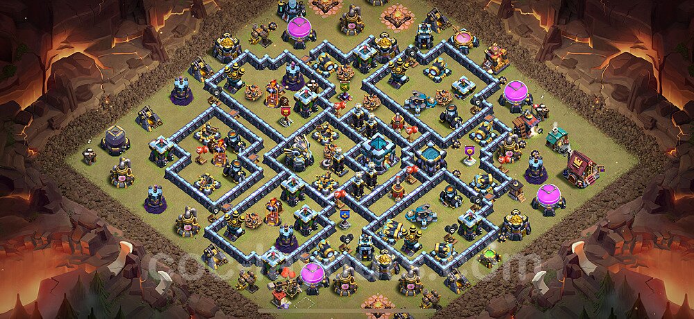 This Town Hall 13 war base is specifically designed to defend against 2-star and 3-star attacks in Clan Wars and Clan War Leagues. The strategic placement of defenses creates multiple compartments that force attackers to use more troops and spells than anticipated. Key defensive structures like Eagle Artillery, Inferno Towers, and X-Bows are positioned to cover crucial sections of the base, making it extremely difficult for opponents to secure a perfect attack. The core of this war base features a centralized Town Hall and Clan Castle, protected by multiple layers of walls and high-damage defenses. This layout forces attackers to commit significant resources just to reach the center, often leaving them without enough firepower to secure the Town Hall destruction. The anti-2-star design ensures that even if attackers breach the outer defenses, they'll struggle to achieve a 50% destruction rating. Air defenses are strategically spread to counter popular air attack strategies like LaLoon (Lava Hound + Balloons) and Electrone (Electro Dragons + Stone Slammer). The symmetrical trap placement and strategic Hidden Tesla positions create deadly surprise elements that can completely derail an attacker's plan. This base has been tested against various meta attack strategies and has consistently proven effective in preventing 3-star attacks.
