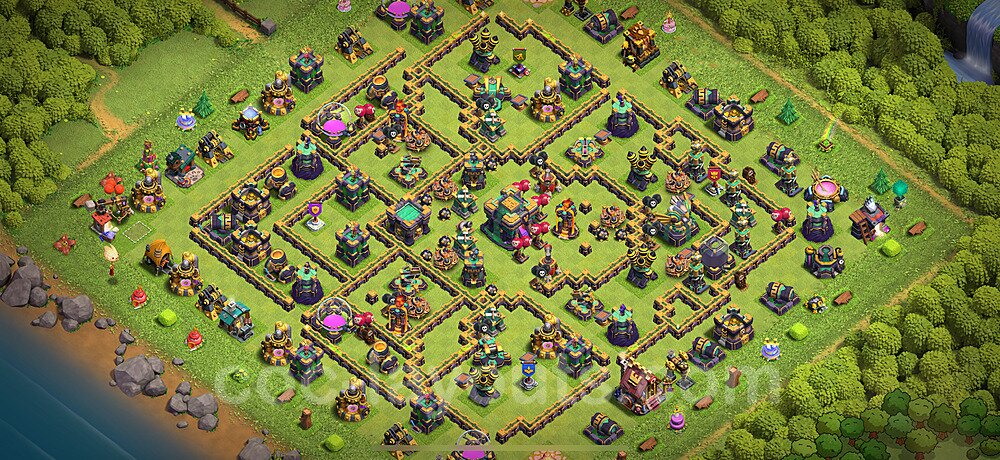This Town Hall 14 war base is specifically designed to defend against 2-star and 3-star attacks in Clan Wars and Clan War Leagues. The strategic placement of defenses creates multiple compartments that force attackers to use more troops and spells than anticipated. Key defensive structures like Eagle Artillery, Inferno Towers, and X-Bows are positioned to cover crucial sections of the base, making it extremely difficult for opponents to secure a perfect attack. The core of this war base features a centralized Town Hall and Clan Castle, protected by multiple layers of walls and high-damage defenses. This layout forces attackers to commit significant resources just to reach the center, often leaving them without enough firepower to secure the Town Hall destruction. The anti-2-star design ensures that even if attackers breach the outer defenses, they'll struggle to achieve a 50% destruction rating. Air defenses are strategically spread to counter popular air attack strategies like LaLoon (Lava Hound + Balloons) and Electrone (Electro Dragons + Stone Slammer). The symmetrical trap placement and strategic Hidden Tesla positions create deadly surprise elements that can completely derail an attacker's plan. This base has been tested against various meta attack strategies and has consistently proven effective in preventing 3-star attacks.