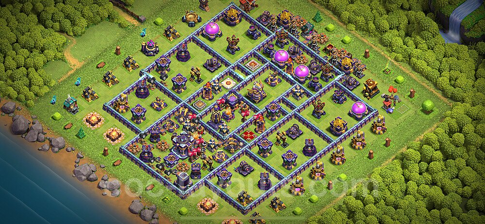 This Town Hall 15 war base is specifically designed to defend against 2-star and 3-star attacks in Clan Wars and Clan War Leagues. The strategic placement of defenses creates multiple compartments that force attackers to use more troops and spells than anticipated. Key defensive structures like Eagle Artillery, Inferno Towers, and X-Bows are positioned to cover crucial sections of the base, making it extremely difficult for opponents to secure a perfect attack. The core of this war base features a centralized Town Hall and Clan Castle, protected by multiple layers of walls and high-damage defenses. This layout forces attackers to commit significant resources just to reach the center, often leaving them without enough firepower to secure the Town Hall destruction. The anti-2-star design ensures that even if attackers breach the outer defenses, they'll struggle to achieve a 50% destruction rating. Air defenses are strategically spread to counter popular air attack strategies like LaLoon (Lava Hound + Balloons) and Electrone (Electro Dragons + Stone Slammer). The symmetrical trap placement and strategic Hidden Tesla positions create deadly surprise elements that can completely derail an attacker's plan. This base has been tested against various meta attack strategies and has consistently proven effective in preventing 3-star attacks.