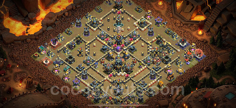 This Town Hall 17 war base is specifically designed to defend against 2-star and 3-star attacks in Clan Wars and Clan War Leagues. The strategic placement of defenses creates multiple compartments that force attackers to use more troops and spells than anticipated. Key defensive structures like Eagle Artillery, Inferno Towers, and X-Bows are positioned to cover crucial sections of the base, making it extremely difficult for opponents to secure a perfect attack. The core of this war base features a centralized Town Hall and Clan Castle, protected by multiple layers of walls and high-damage defenses. This layout forces attackers to commit significant resources just to reach the center, often leaving them without enough firepower to secure the Town Hall destruction. The anti-2-star design ensures that even if attackers breach the outer defenses, they'll struggle to achieve a 50% destruction rating. Air defenses are strategically spread to counter popular air attack strategies like LaLoon (Lava Hound + Balloons) and Electrone (Electro Dragons + Stone Slammer). The symmetrical trap placement and strategic Hidden Tesla positions create deadly surprise elements that can completely derail an attacker's plan. This base has been tested against various meta attack strategies and has consistently proven effective in preventing 3-star attacks.