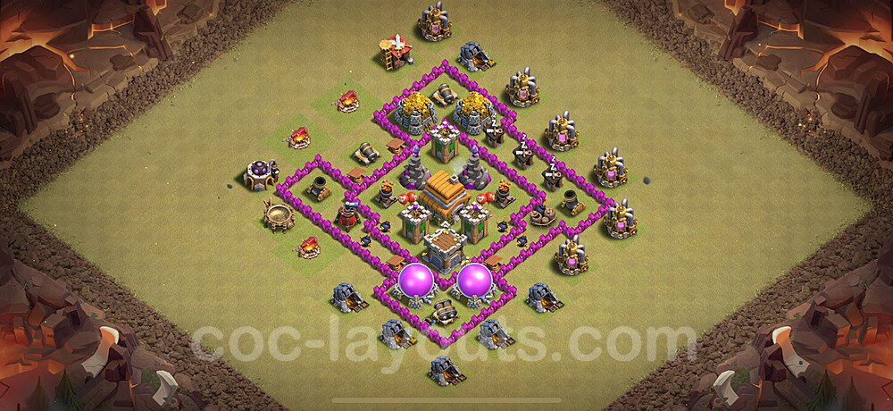 This Town Hall 6 war base is specifically designed to defend against 2-star and 3-star attacks in Clan Wars and Clan War Leagues. The strategic placement of defenses creates multiple compartments that force attackers to use more troops and spells than anticipated. Key defensive structures like Eagle Artillery, Inferno Towers, and X-Bows are positioned to cover crucial sections of the base, making it extremely difficult for opponents to secure a perfect attack. The core of this war base features a centralized Town Hall and Clan Castle, protected by multiple layers of walls and high-damage defenses. This layout forces attackers to commit significant resources just to reach the center, often leaving them without enough firepower to secure the Town Hall destruction. The anti-2-star design ensures that even if attackers breach the outer defenses, they'll struggle to achieve a 50% destruction rating. Air defenses are strategically spread to counter popular air attack strategies like LaLoon (Lava Hound + Balloons) and Electrone (Electro Dragons + Stone Slammer). The symmetrical trap placement and strategic Hidden Tesla positions create deadly surprise elements that can completely derail an attacker's plan. This base has been tested against various meta attack strategies and has consistently proven effective in preventing 3-star attacks.