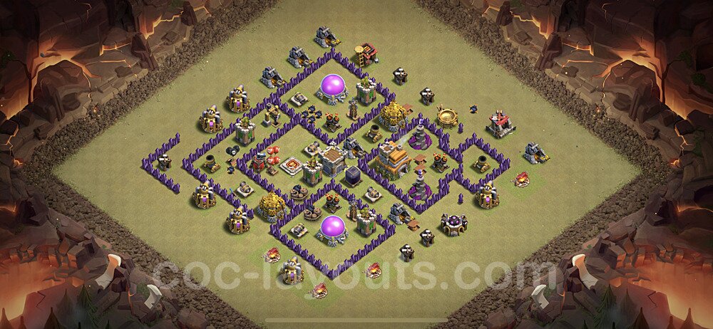 This Town Hall 7 hybrid base offers the best of both worlds - strong resource protection combined with effective trophy defense. The versatile design makes it an excellent choice for players who want to protect their loot while maintaining their trophy count. This balanced approach ensures you don't sacrifice one aspect of defense for another, making it ideal for active players across all league levels. The hybrid layout features centralized resource storages alongside a well-protected Town Hall, with multiple defensive layers that deter both farming raids and trophy pushers. High-value targets are strategically positioned within overlapping defense ranges, forcing attackers to make difficult choices about which objectives to prioritize. The compartmentalized design prevents attackers from easily achieving both loot destruction and the Town Hall kill in a single attack. Defense placement in this hybrid base creates strong coverage against both ground and air attacks. Inferno Towers, X-Bows, and Eagle Artillery work in concert to eliminate threats quickly, while splash damage defenses like Wizard Towers and Bomb Towers counter swarm strategies. The base's funnel-resistant design and strategic trap placement make it effective against popular attack strategies including QC LaLoon (Queen Charge Lava Hound Balloon), Blizzard attacks, and Yeti Smash compositions.