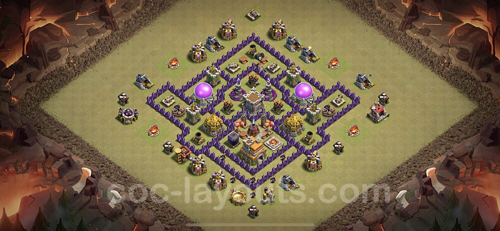 This Town Hall 7 hybrid base offers the best of both worlds - strong resource protection combined with effective trophy defense. The versatile design makes it an excellent choice for players who want to protect their loot while maintaining their trophy count. This balanced approach ensures you don't sacrifice one aspect of defense for another, making it ideal for active players across all league levels. The hybrid layout features centralized resource storages alongside a well-protected Town Hall, with multiple defensive layers that deter both farming raids and trophy pushers. High-value targets are strategically positioned within overlapping defense ranges, forcing attackers to make difficult choices about which objectives to prioritize. The compartmentalized design prevents attackers from easily achieving both loot destruction and the Town Hall kill in a single attack. Defense placement in this hybrid base creates strong coverage against both ground and air attacks. Inferno Towers, X-Bows, and Eagle Artillery work in concert to eliminate threats quickly, while splash damage defenses like Wizard Towers and Bomb Towers counter swarm strategies. The base's funnel-resistant design and strategic trap placement make it effective against popular attack strategies including QC LaLoon (Queen Charge Lava Hound Balloon), Blizzard attacks, and Yeti Smash compositions.