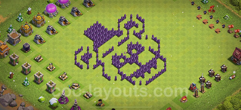 This Town Hall 7 war base is specifically designed to defend against 2-star and 3-star attacks in Clan Wars and Clan War Leagues. The strategic placement of defenses creates multiple compartments that force attackers to use more troops and spells than anticipated. Key defensive structures like Eagle Artillery, Inferno Towers, and X-Bows are positioned to cover crucial sections of the base, making it extremely difficult for opponents to secure a perfect attack. The core of this war base features a centralized Town Hall and Clan Castle, protected by multiple layers of walls and high-damage defenses. This layout forces attackers to commit significant resources just to reach the center, often leaving them without enough firepower to secure the Town Hall destruction. The anti-2-star design ensures that even if attackers breach the outer defenses, they'll struggle to achieve a 50% destruction rating. Air defenses are strategically spread to counter popular air attack strategies like LaLoon (Lava Hound + Balloons) and Electrone (Electro Dragons + Stone Slammer). The symmetrical trap placement and strategic Hidden Tesla positions create deadly surprise elements that can completely derail an attacker's plan. This base has been tested against various meta attack strategies and has consistently proven effective in preventing 3-star attacks.