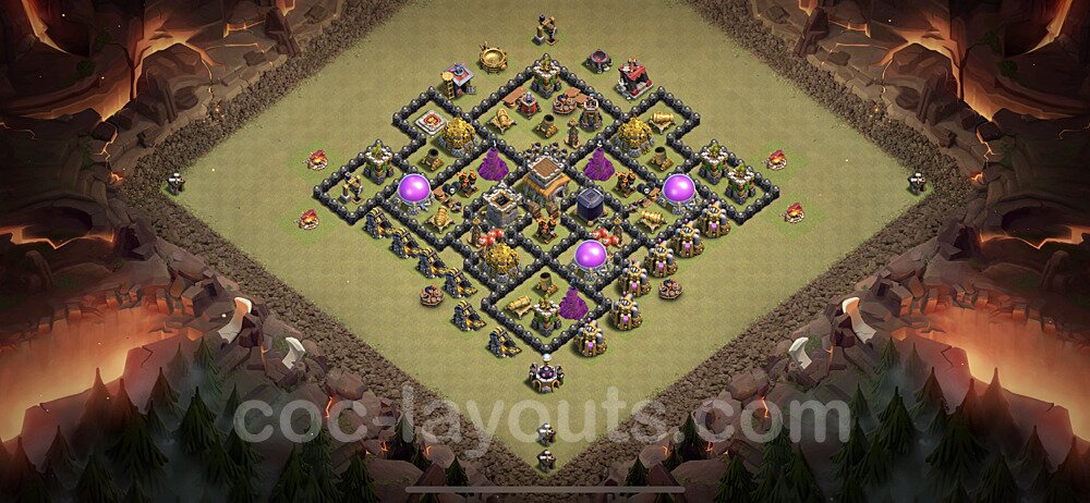 This Town Hall 8 hybrid base offers the best of both worlds - strong resource protection combined with effective trophy defense. The versatile design makes it an excellent choice for players who want to protect their loot while maintaining their trophy count. This balanced approach ensures you don't sacrifice one aspect of defense for another, making it ideal for active players across all league levels. The hybrid layout features centralized resource storages alongside a well-protected Town Hall, with multiple defensive layers that deter both farming raids and trophy pushers. High-value targets are strategically positioned within overlapping defense ranges, forcing attackers to make difficult choices about which objectives to prioritize. The compartmentalized design prevents attackers from easily achieving both loot destruction and the Town Hall kill in a single attack. Defense placement in this hybrid base creates strong coverage against both ground and air attacks. Inferno Towers, X-Bows, and Eagle Artillery work in concert to eliminate threats quickly, while splash damage defenses like Wizard Towers and Bomb Towers counter swarm strategies. The base's funnel-resistant design and strategic trap placement make it effective against popular attack strategies including QC LaLoon (Queen Charge Lava Hound Balloon), Blizzard attacks, and Yeti Smash compositions.
