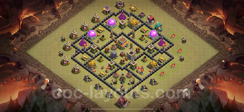 This Town Hall 8 war base is specifically designed to defend against 2-star and 3-star attacks in Clan Wars and Clan War Leagues. The strategic placement of defenses creates multiple compartments that force attackers to use more troops and spells than anticipated. Key defensive structures like Eagle Artillery, Inferno Towers, and X-Bows are positioned to cover crucial sections of the base, making it extremely difficult for opponents to secure a perfect attack. The core of this war base features a centralized Town Hall and Clan Castle, protected by multiple layers of walls and high-damage defenses. This layout forces attackers to commit significant resources just to reach the center, often leaving them without enough firepower to secure the Town Hall destruction. The anti-2-star design ensures that even if attackers breach the outer defenses, they'll struggle to achieve a 50% destruction rating. Air defenses are strategically spread to counter popular air attack strategies like LaLoon (Lava Hound + Balloons) and Electrone (Electro Dragons + Stone Slammer). The symmetrical trap placement and strategic Hidden Tesla positions create deadly surprise elements that can completely derail an attacker's plan. This base has been tested against various meta attack strategies and has consistently proven effective in preventing 3-star attacks.