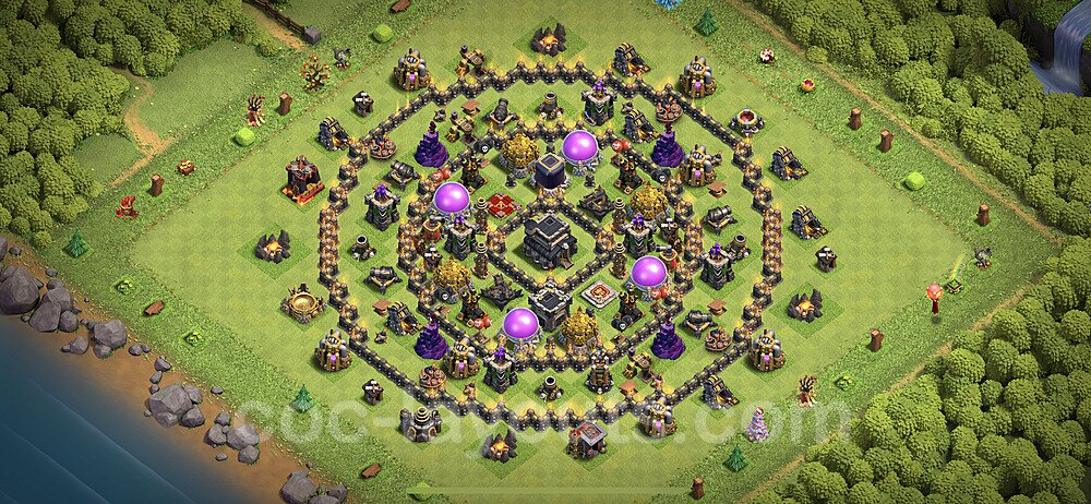 This Town Hall 9 hybrid base offers the best of both worlds - strong resource protection combined with effective trophy defense. The versatile design makes it an excellent choice for players who want to protect their loot while maintaining their trophy count. This balanced approach ensures you don't sacrifice one aspect of defense for another, making it ideal for active players across all league levels. The hybrid layout features centralized resource storages alongside a well-protected Town Hall, with multiple defensive layers that deter both farming raids and trophy pushers. High-value targets are strategically positioned within overlapping defense ranges, forcing attackers to make difficult choices about which objectives to prioritize. The compartmentalized design prevents attackers from easily achieving both loot destruction and the Town Hall kill in a single attack. Defense placement in this hybrid base creates strong coverage against both ground and air attacks. Inferno Towers, X-Bows, and Eagle Artillery work in concert to eliminate threats quickly, while splash damage defenses like Wizard Towers and Bomb Towers counter swarm strategies. The base's funnel-resistant design and strategic trap placement make it effective against popular attack strategies including QC LaLoon (Queen Charge Lava Hound Balloon), Blizzard attacks, and Yeti Smash compositions.