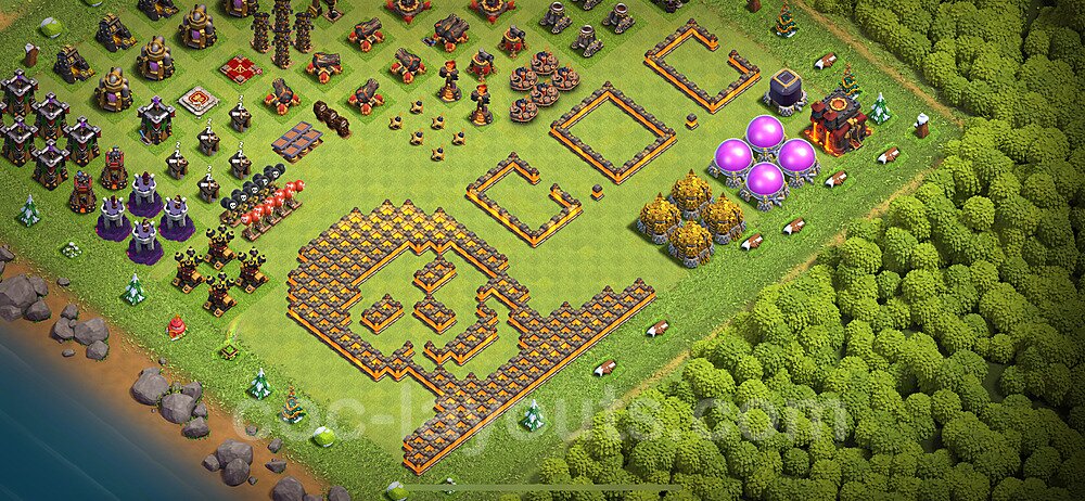 This Town Hall 10 war base is specifically designed to defend against 2-star and 3-star attacks in Clan Wars and Clan War Leagues. The strategic placement of defenses creates multiple compartments that force attackers to use more troops and spells than anticipated. Key defensive structures like Eagle Artillery, Inferno Towers, and X-Bows are positioned to cover crucial sections of the base, making it extremely difficult for opponents to secure a perfect attack. The core of this war base features a centralized Town Hall and Clan Castle, protected by multiple layers of walls and high-damage defenses. This layout forces attackers to commit significant resources just to reach the center, often leaving them without enough firepower to secure the Town Hall destruction. The anti-2-star design ensures that even if attackers breach the outer defenses, they'll struggle to achieve a 50% destruction rating. Air defenses are strategically spread to counter popular air attack strategies like LaLoon (Lava Hound + Balloons) and Electrone (Electro Dragons + Stone Slammer). The symmetrical trap placement and strategic Hidden Tesla positions create deadly surprise elements that can completely derail an attacker's plan. This base has been tested against various meta attack strategies and has consistently proven effective in preventing 3-star attacks.