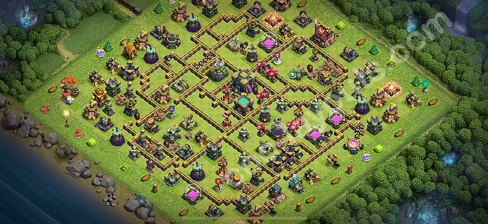 This Town Hall 14 war base is specifically designed to defend against 2-star and 3-star attacks in Clan Wars and Clan War Leagues. The strategic placement of defenses creates multiple compartments that force attackers to use more troops and spells than anticipated. Key defensive structures like Eagle Artillery, Inferno Towers, and X-Bows are positioned to cover crucial sections of the base, making it extremely difficult for opponents to secure a perfect attack. The core of this war base features a centralized Town Hall and Clan Castle, protected by multiple layers of walls and high-damage defenses. This layout forces attackers to commit significant resources just to reach the center, often leaving them without enough firepower to secure the Town Hall destruction. The anti-2-star design ensures that even if attackers breach the outer defenses, they'll struggle to achieve a 50% destruction rating. Air defenses are strategically spread to counter popular air attack strategies like LaLoon (Lava Hound + Balloons) and Electrone (Electro Dragons + Stone Slammer). The symmetrical trap placement and strategic Hidden Tesla positions create deadly surprise elements that can completely derail an attacker's plan. This base has been tested against various meta attack strategies and has consistently proven effective in preventing 3-star attacks.