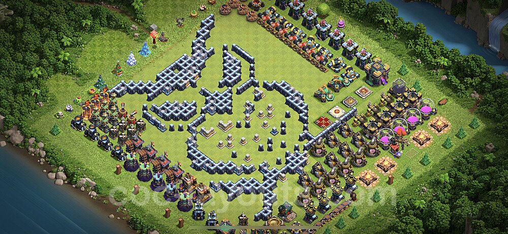 This Town Hall 14 war base is specifically designed to defend against 2-star and 3-star attacks in Clan Wars and Clan War Leagues. The strategic placement of defenses creates multiple compartments that force attackers to use more troops and spells than anticipated. Key defensive structures like Eagle Artillery, Inferno Towers, and X-Bows are positioned to cover crucial sections of the base, making it extremely difficult for opponents to secure a perfect attack. The core of this war base features a centralized Town Hall and Clan Castle, protected by multiple layers of walls and high-damage defenses. This layout forces attackers to commit significant resources just to reach the center, often leaving them without enough firepower to secure the Town Hall destruction. The anti-2-star design ensures that even if attackers breach the outer defenses, they'll struggle to achieve a 50% destruction rating. Air defenses are strategically spread to counter popular air attack strategies like LaLoon (Lava Hound + Balloons) and Electrone (Electro Dragons + Stone Slammer). The symmetrical trap placement and strategic Hidden Tesla positions create deadly surprise elements that can completely derail an attacker's plan. This base has been tested against various meta attack strategies and has consistently proven effective in preventing 3-star attacks.