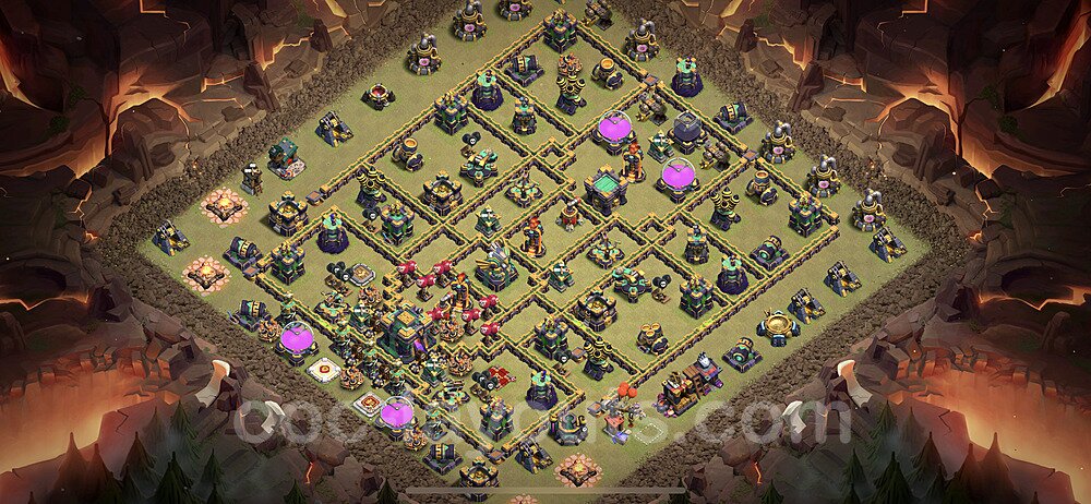 This Town Hall 14 war base is specifically designed to defend against 2-star and 3-star attacks in Clan Wars and Clan War Leagues. The strategic placement of defenses creates multiple compartments that force attackers to use more troops and spells than anticipated. Key defensive structures like Eagle Artillery, Inferno Towers, and X-Bows are positioned to cover crucial sections of the base, making it extremely difficult for opponents to secure a perfect attack. The core of this war base features a centralized Town Hall and Clan Castle, protected by multiple layers of walls and high-damage defenses. This layout forces attackers to commit significant resources just to reach the center, often leaving them without enough firepower to secure the Town Hall destruction. The anti-2-star design ensures that even if attackers breach the outer defenses, they'll struggle to achieve a 50% destruction rating. Air defenses are strategically spread to counter popular air attack strategies like LaLoon (Lava Hound + Balloons) and Electrone (Electro Dragons + Stone Slammer). The symmetrical trap placement and strategic Hidden Tesla positions create deadly surprise elements that can completely derail an attacker's plan. This base has been tested against various meta attack strategies and has consistently proven effective in preventing 3-star attacks.